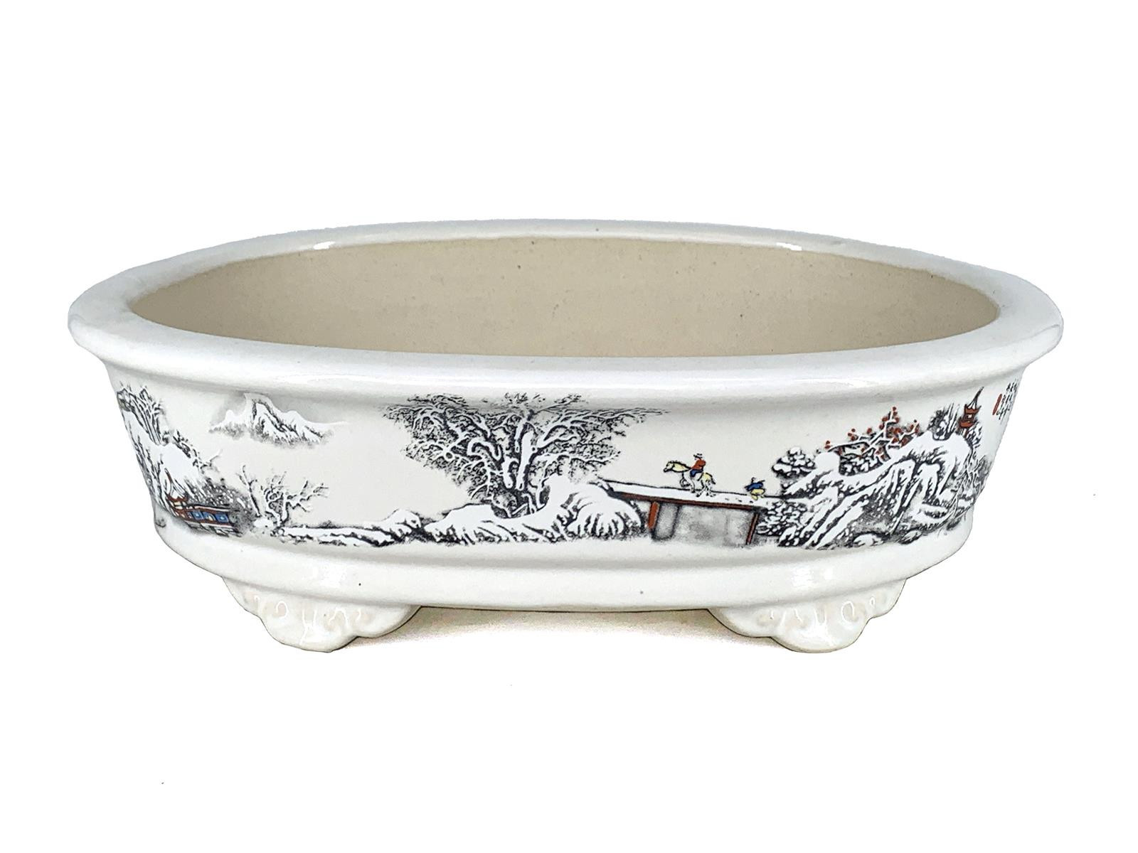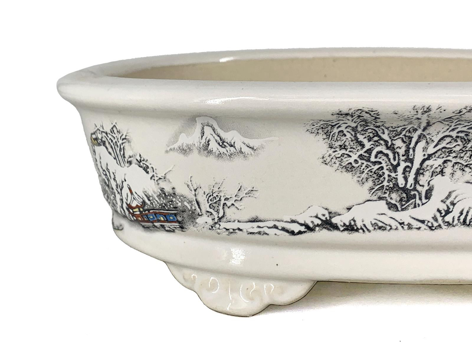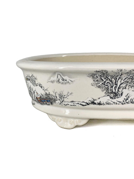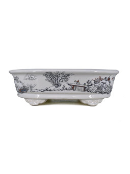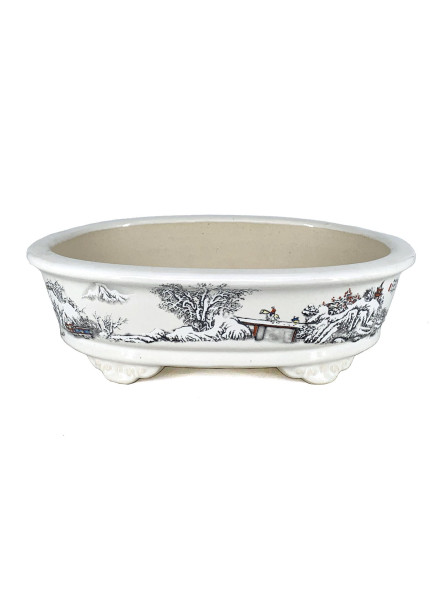 Tiesto ovalado 26 cm Yixing blanco con dibujo CPA99